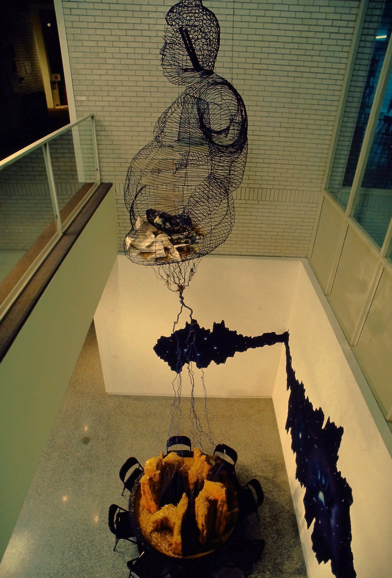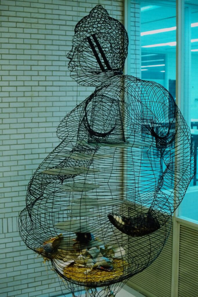 Suspended in the open air above the third floor is a black box, filled with water—an enigmatic presence, an unseen source. From a simple faucet, water drips slowly and rhythmically down to the second floor, landing in a glass dish within a suspended cage shaped like a Buddha.