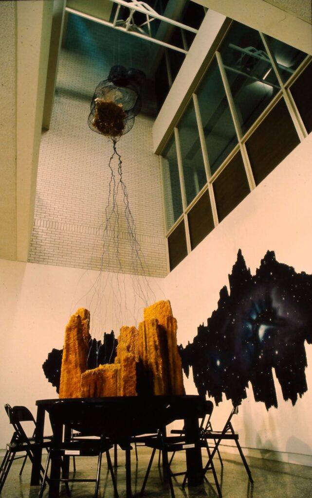 Rat-Buddha was exhibited in 1989 in the three-story atrium of the Minneapolis College of Art and Design as part of the McKnight Foundation Fellowship Exhibition.