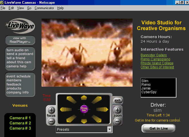 Two additional video cameras are stationed at the perimeter, one of which is user-controlled via the Internet. Viewers can pan, tilt, and zoom the live video feed—transforming the passive act of looking into an interactive, participatory event. In this way, Video Studio for Insects builds on my earlier experiments in remote-access art that began with artnetweb, a collective I led in a New York City storefront during the formative years of internet-based art.