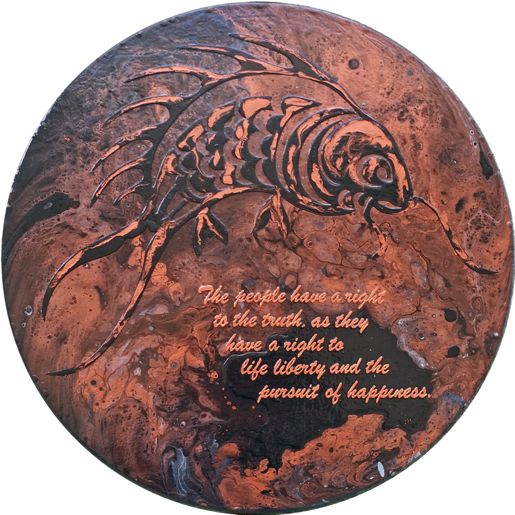 Medium: Acrylic paint on 3d printed plastic on wooden disk.