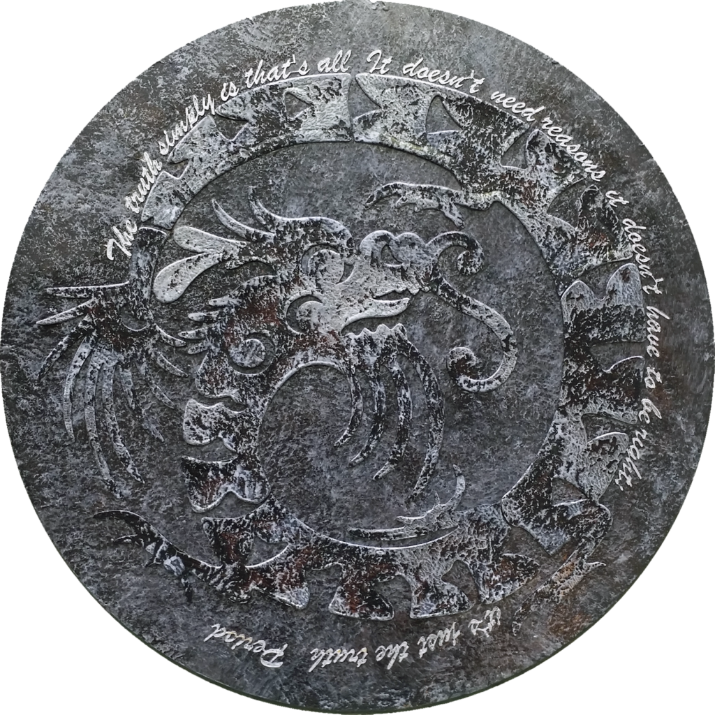 Medium: Acrylic paint on 3d printed plastic on wooden disk.
