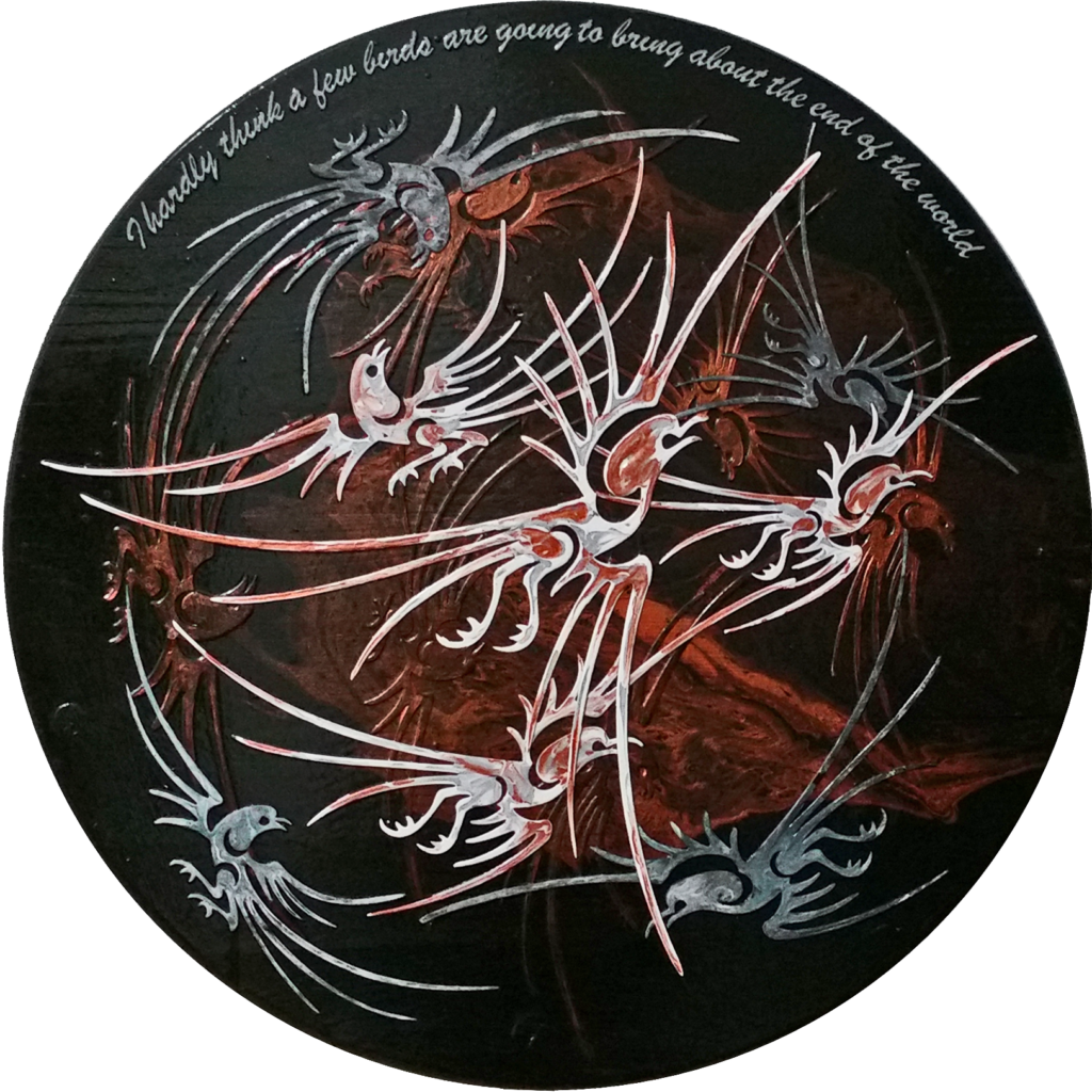 Medium: Acrylic paint on 3d printed plastic on wooden disk.