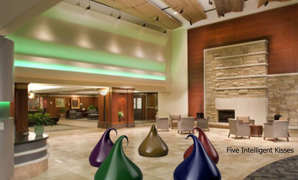 Imagine you are in a downtown building lobby, people coming and going, a bank of elevators to your left, and straight ahead is something that looks like “modern art.” At first glance the art looks like five large multi-colored Hershey’s Kisses. You head for the elevators when you hear a tantalizing whisper coming from one of the Kisses. You stop. There it is again, the whisper. You turn and this time it moves and points at you. You can’t help it. You have to see for yourself, so you cautiously walk over to these five strange objects.