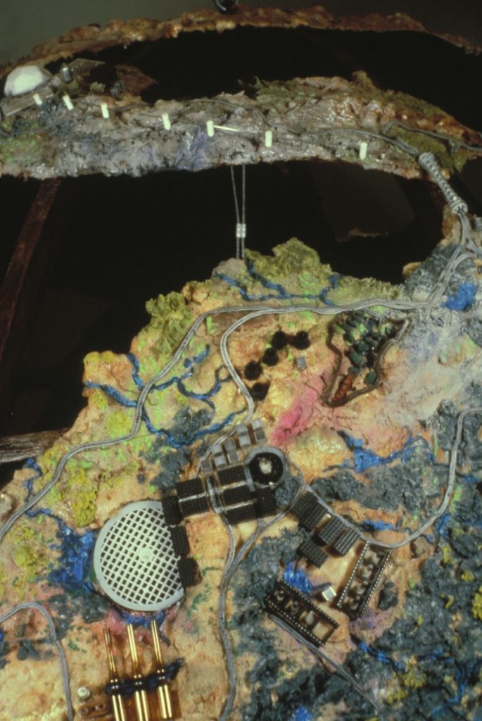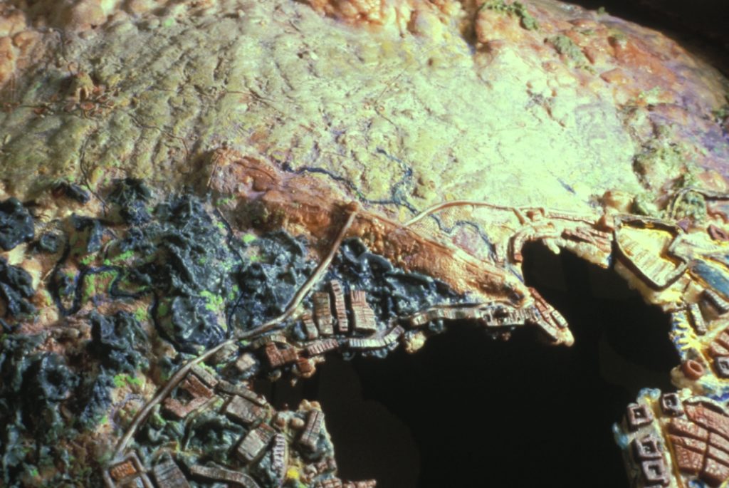 The structure was made of wood and painted with brown wax. The land masses are made of tar paper and stapled onto the wood structure. Over the tar paper we brushed on hot wax and slowly built up the surfaces with wax infused with pigments.