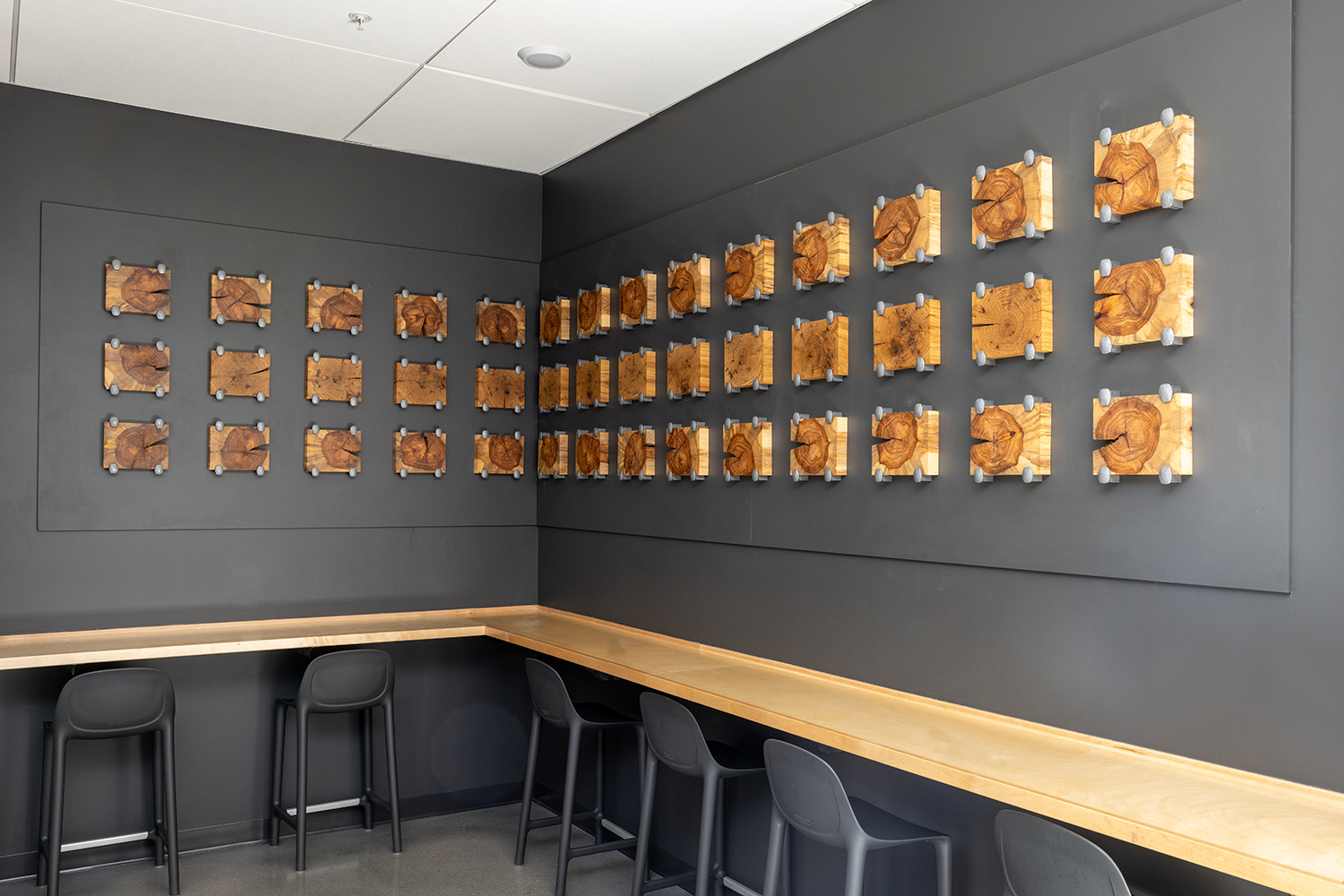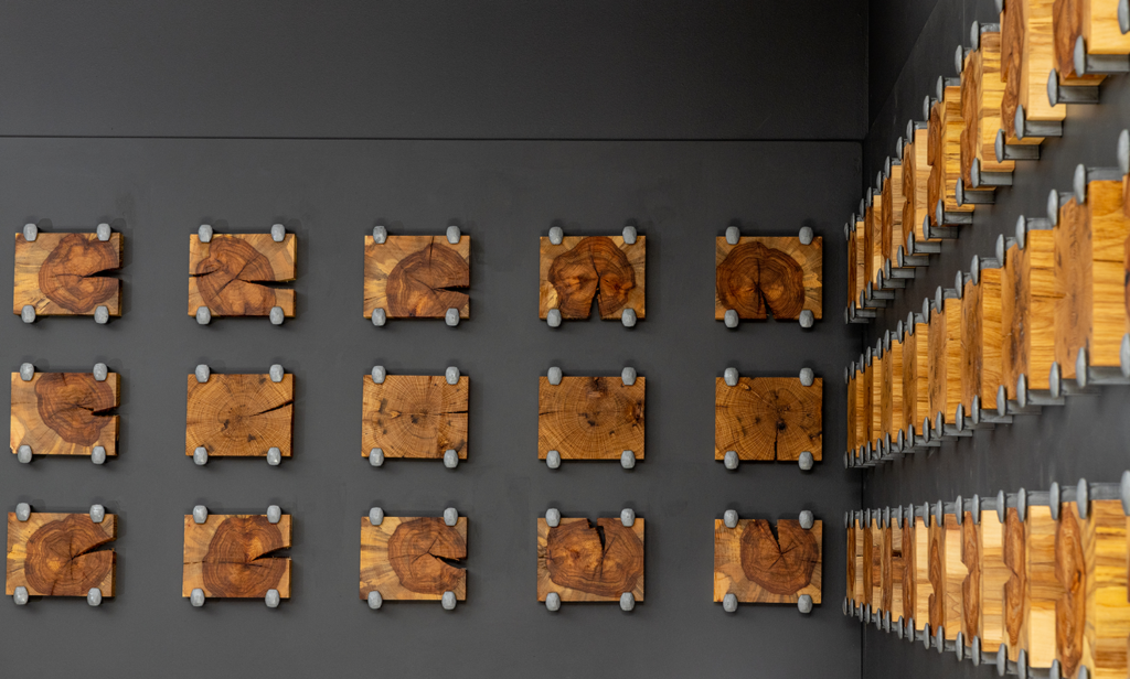 Urban Ties by Remo Campopiano and Justin Hossle is a wall relief sculpture made from 42 2″ slices of oak railroad ties, held in place by railroad spikes. It was installed on the first floor of the Timber & Tie apartment complex at 900 14th Ave NE, Minneapolis, MN 55413.