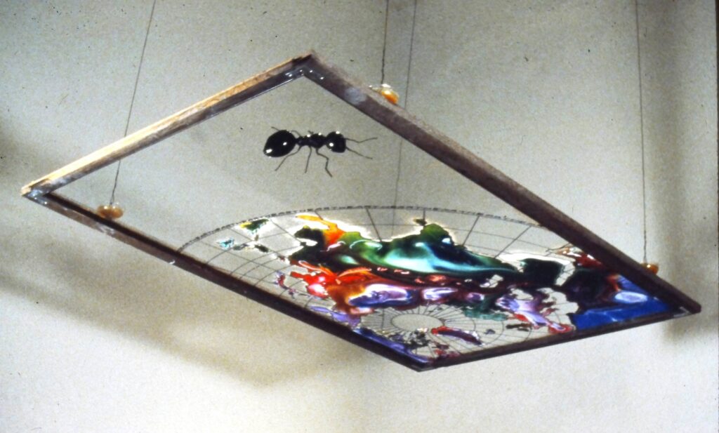 The centerpiece of my installation was a massive glass painting, suspended eight feet off the ground. Visitors would stand beneath it, peering up at the intricate world I had created. To bring it to life—literally—I introduced 500 California Harvester ants, giving them sand to dig in, food to eat, and water to drink.